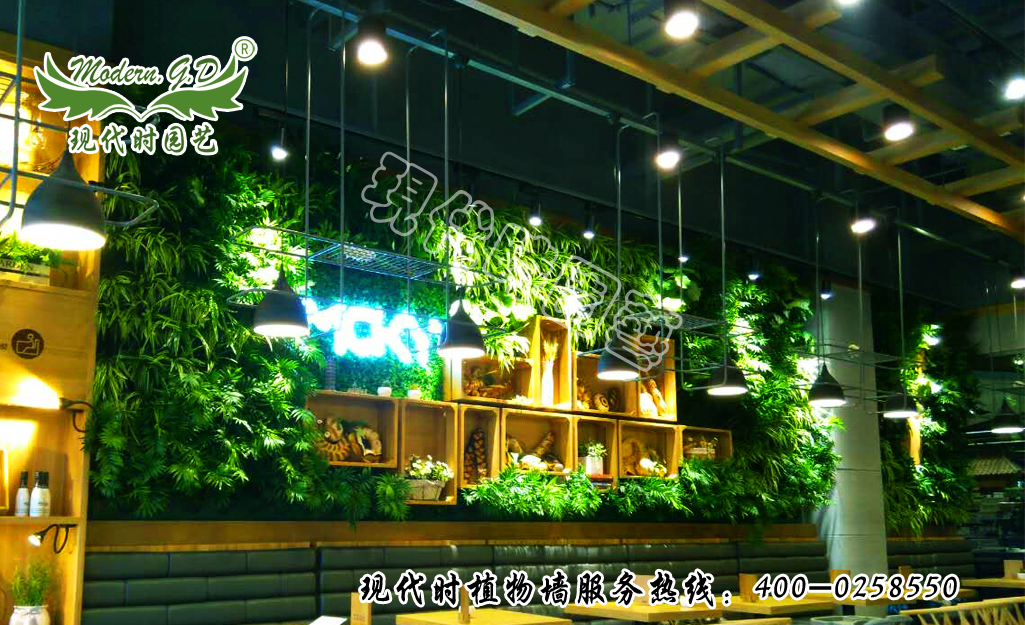 圍繞全國連鎖米旗蛋糕店而設計的綠色環保植物墻,采取工藝為我公司自主研發生產的種植箱模塊式植物墻所施工,安裝簡單快速且有安全及成活率保障。所安裝墻面為圓柱形墻面,采用主色系兩種分別為綠色,共三種植物分別為:綠蘿、金邊吊蘭、袖珍椰子。整體效果美觀整潔,及凈化空氣體現蛋糕店的環保理念又達到很好的墻面裝飾效果